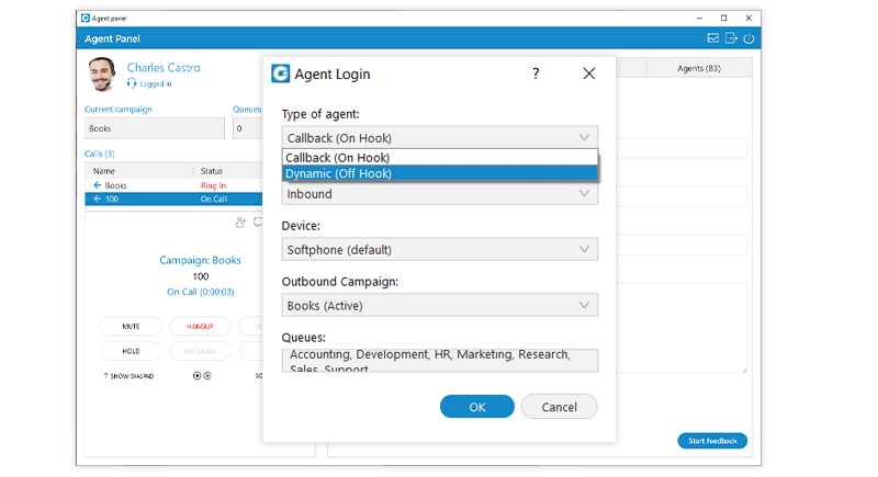 The dynamic login option allows an agent to log remotely into the queue and wait for the next call while listening to Music on Hold. Callback login is the traditional call center configuration where an agent will answer a ringing phone to be joined with the waiting caller.