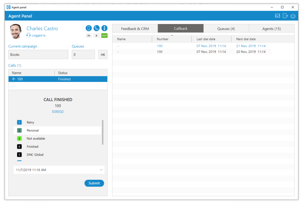 Agent status allows agents to know who is available and if a call can be placed. Decisions can be taken easily such as whether to forward a call or suggest a callback using dispositions.