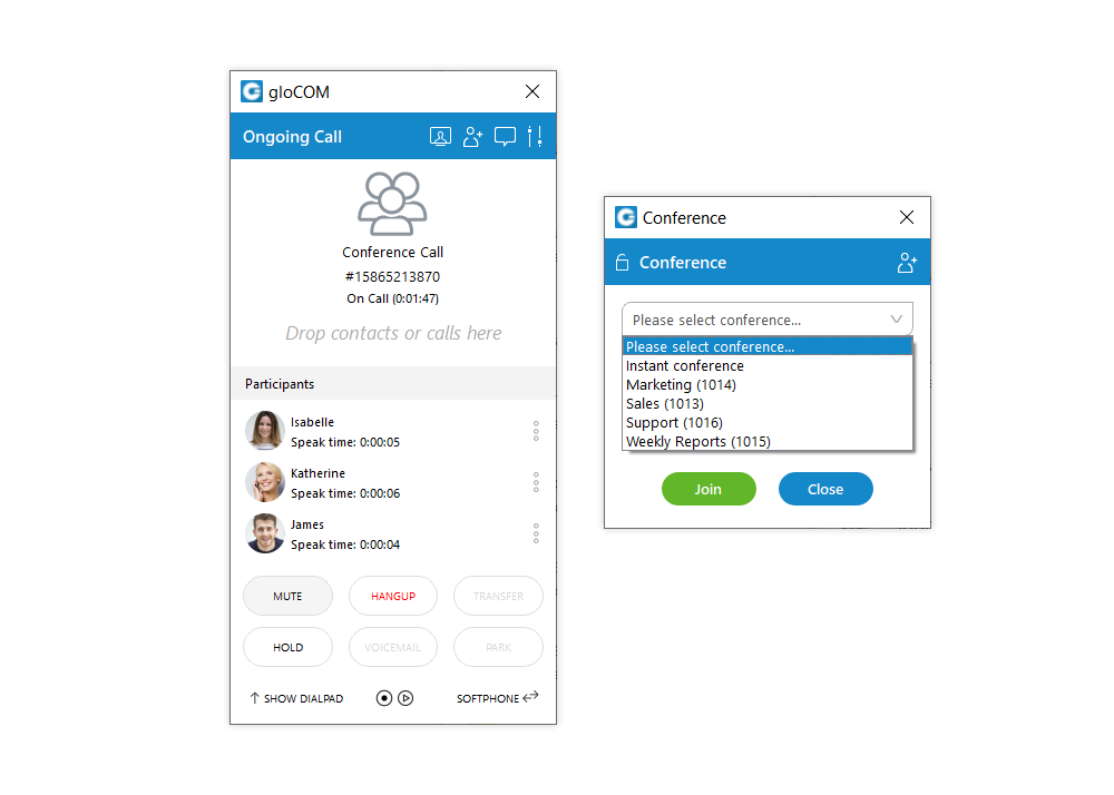 Communicator allows a user to use all unified comms and standard comms features. Create and control dynamic conference calls on any SIP phone or SoftPhone. Convert two-way calls into a conference call, and add as many participants as you’d like (dynamic conferencing). Use drag & drop to easily add a third person to your phone call conversation. The added person receives a call and upon answering they will join the conference call. You can add as many users as needed.