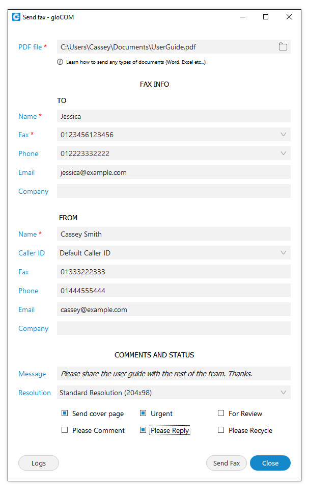 Send a document as a fax directly from its native application (using print/fax driver), or send faxes directly from Communicator (PDF files only). Receive faxes and view them directly on your computer. Check Fax history of received files.