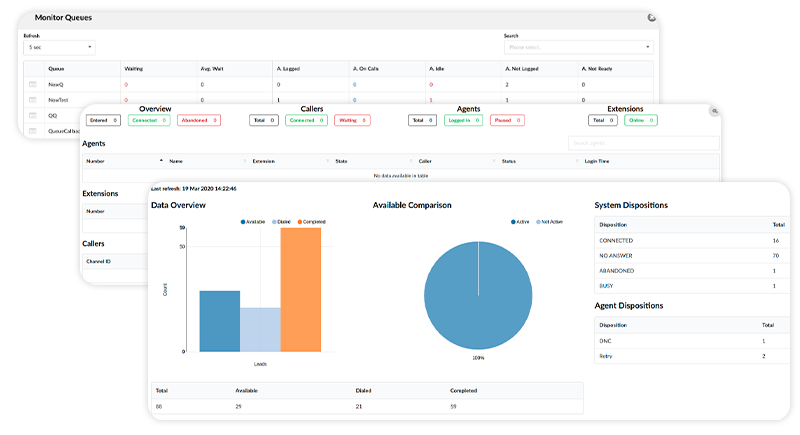 Contact Center Edition has a licensed Dialer feature. This feature allows lists of data to be loaded to a database, after which an application runs and dials these numbers based on the algorithm or settings entered by the Administrator. The Agent’s interface of the Dialer displays Agents with specified information regarding each call. Furthermore, this information is customizable through the Administrator login.